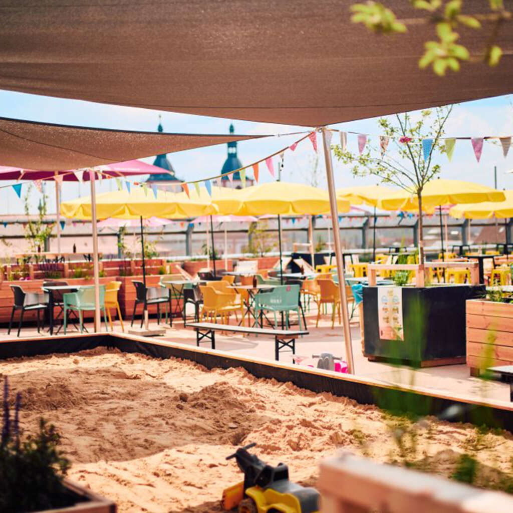 Karlchen vom Dach – der Rooftop Biergarten. Erlebe Gastro und Kultur über den Dächern Fuldas. Im Sommer pulsierender Biergarten mit Urban Gardening, Boulebahnen, Yoga Sessions und Sandkasten – im Dezember zauberhafter Wintergarten mit Eislaufbahn, Eisstockschießen und Glühwein.